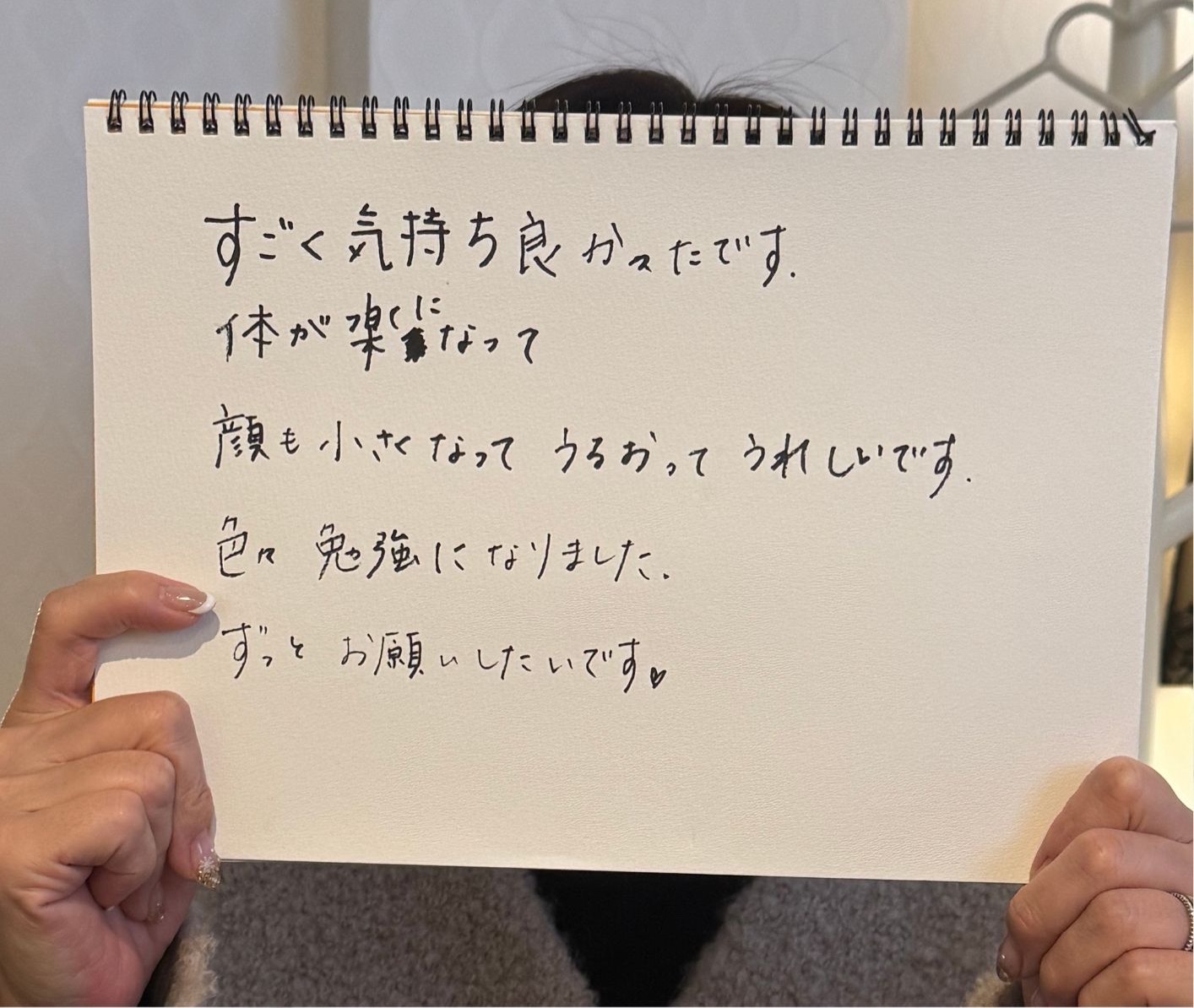 サロンでは姿勢や生活習慣、ホームケアのアドバイス等細かいところにもたくさん温かいお心遣いをいただきました。
